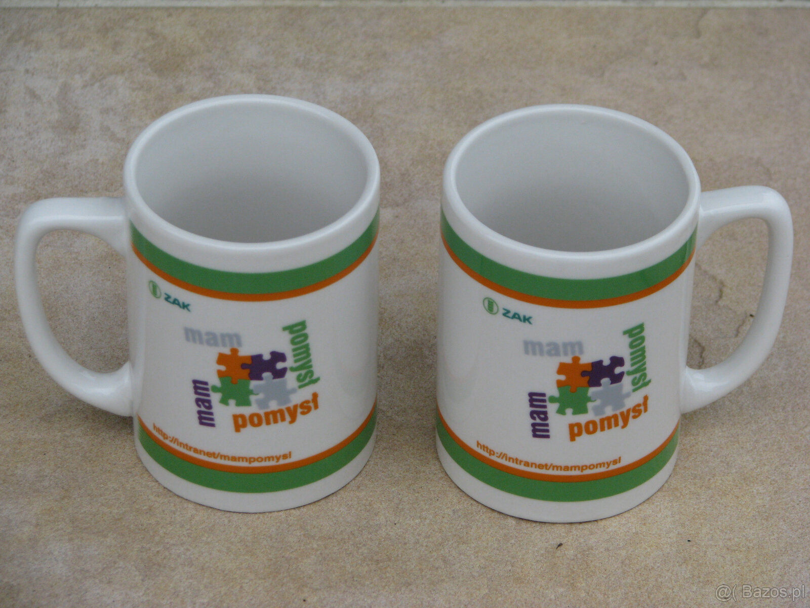 Sprzedam pamiątkowy, biały kubek porcelanowy z kolorowym motywem puzzli wyprodukowany dla ZAK SA Kędzierzyn – głównego sponsora klubu siatkarskiego ZAKSA jeszcze przed połączeniem z Grupą Azoty.