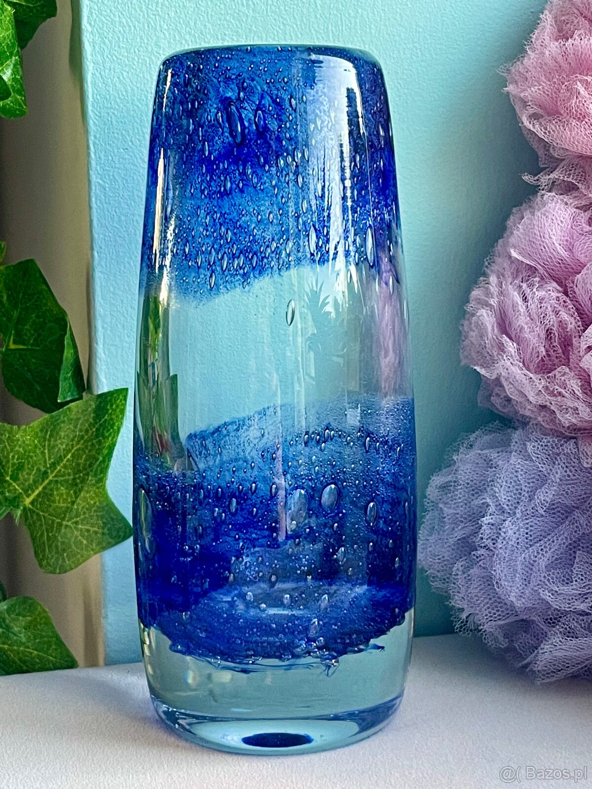 Stylowy wazon wykonany z grubego, masywnego szkła artystycznego. Charakterystyczna technika pulegoso z zatopionymi pęcherzykami powietrza tworzy efektowną strukturę. Kolorystyka przechodzi od głębokiego kobaltu u podstawy po krystaliczną górę. Stylistyka lat 60/70. XX wieku.