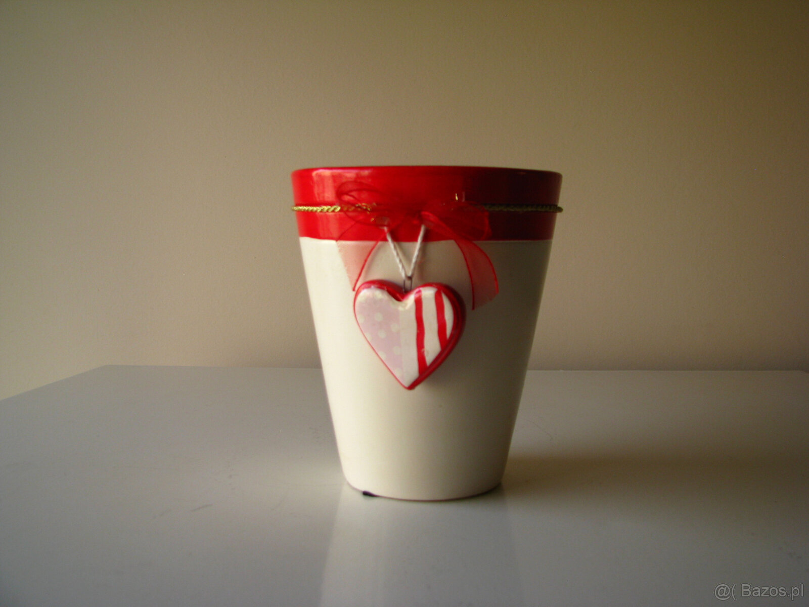 Sprzedam urocze, ceramiczne naczynko - osłonkę na doniczkę z serduszkiem w kolorze ecru i czerwonym, ozdobioną złotym sznureczkiem i ceramicznym serduszkiem z szyfonową kokardką.